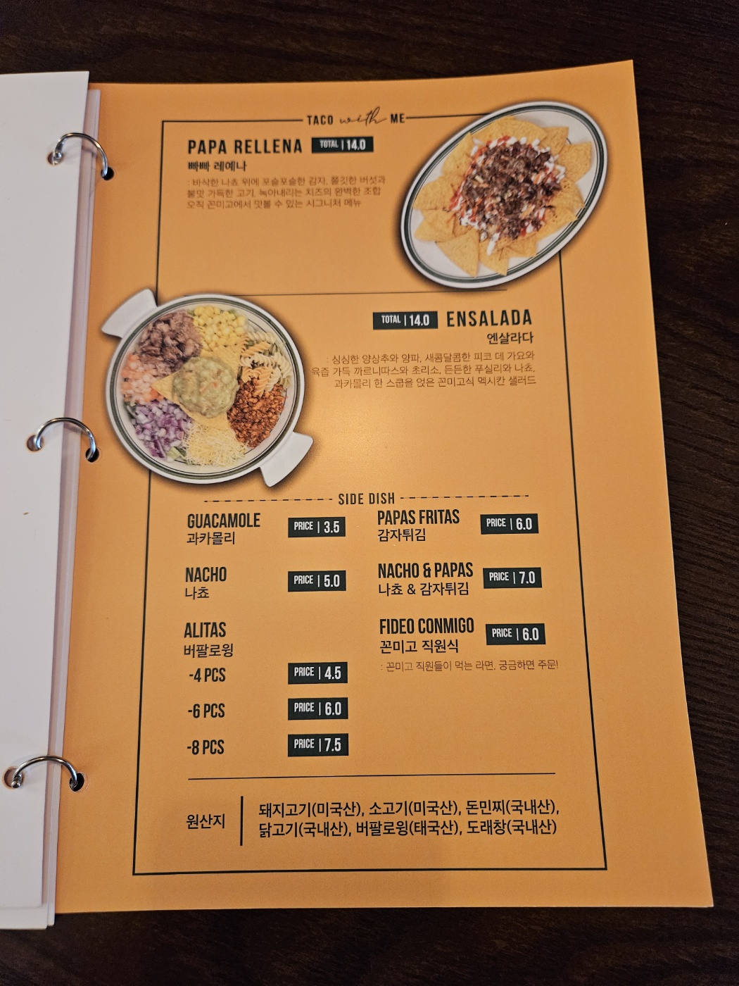 타코가 4개 나와서 뒷장에 여러 종류의 타코를 고를 수 있었어요.
