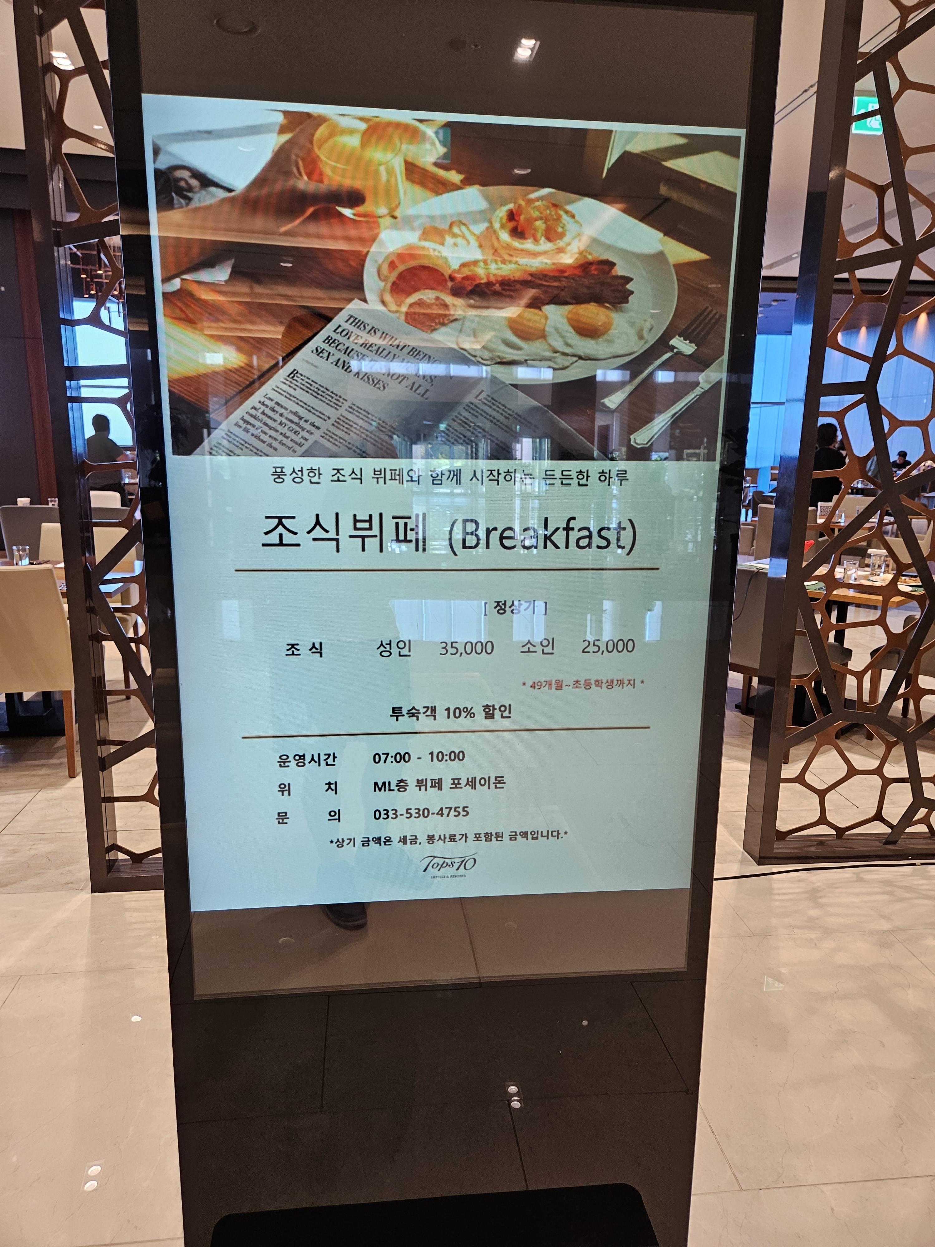 조식은 성인 35,000원 / 소인 25,000원이고 투숙객은 10% 할인받을 수 있습니다.