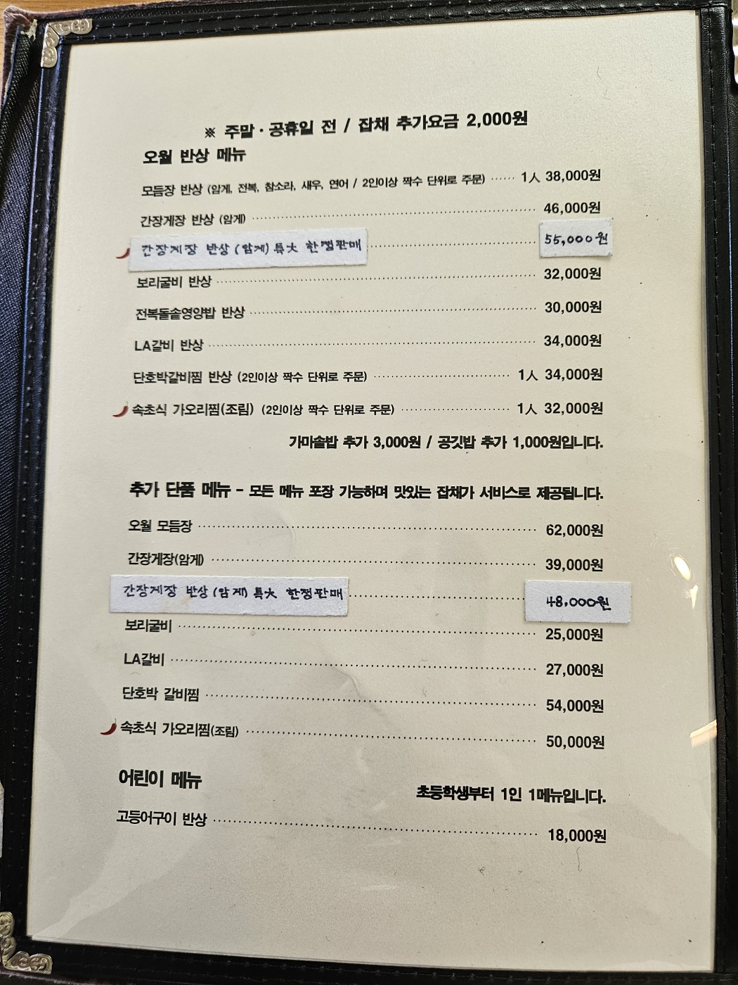메뉴는 모듬장, 간장게장, 보리굴비, 전복돌솥영양밥, LA갈비, 단호박갈비찜,