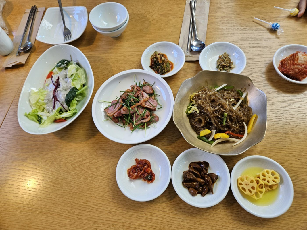 기본찬은 오리구이, 샐러드, 연근 등으로 구성되어 있는데 반찬 하나하나 맛있었어요.