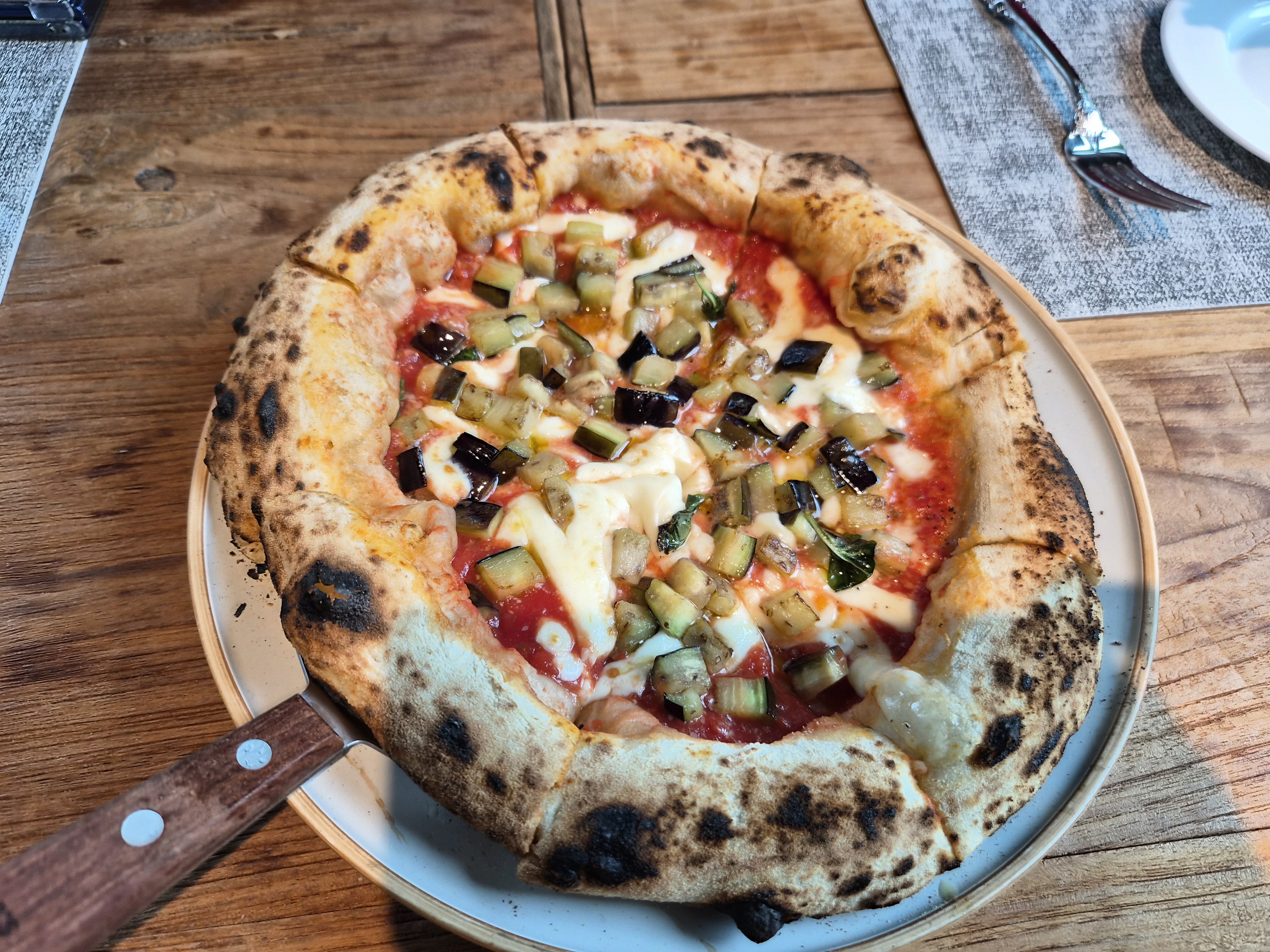 가지 피자, 고르곤졸라 피자, 콜라, 사이다