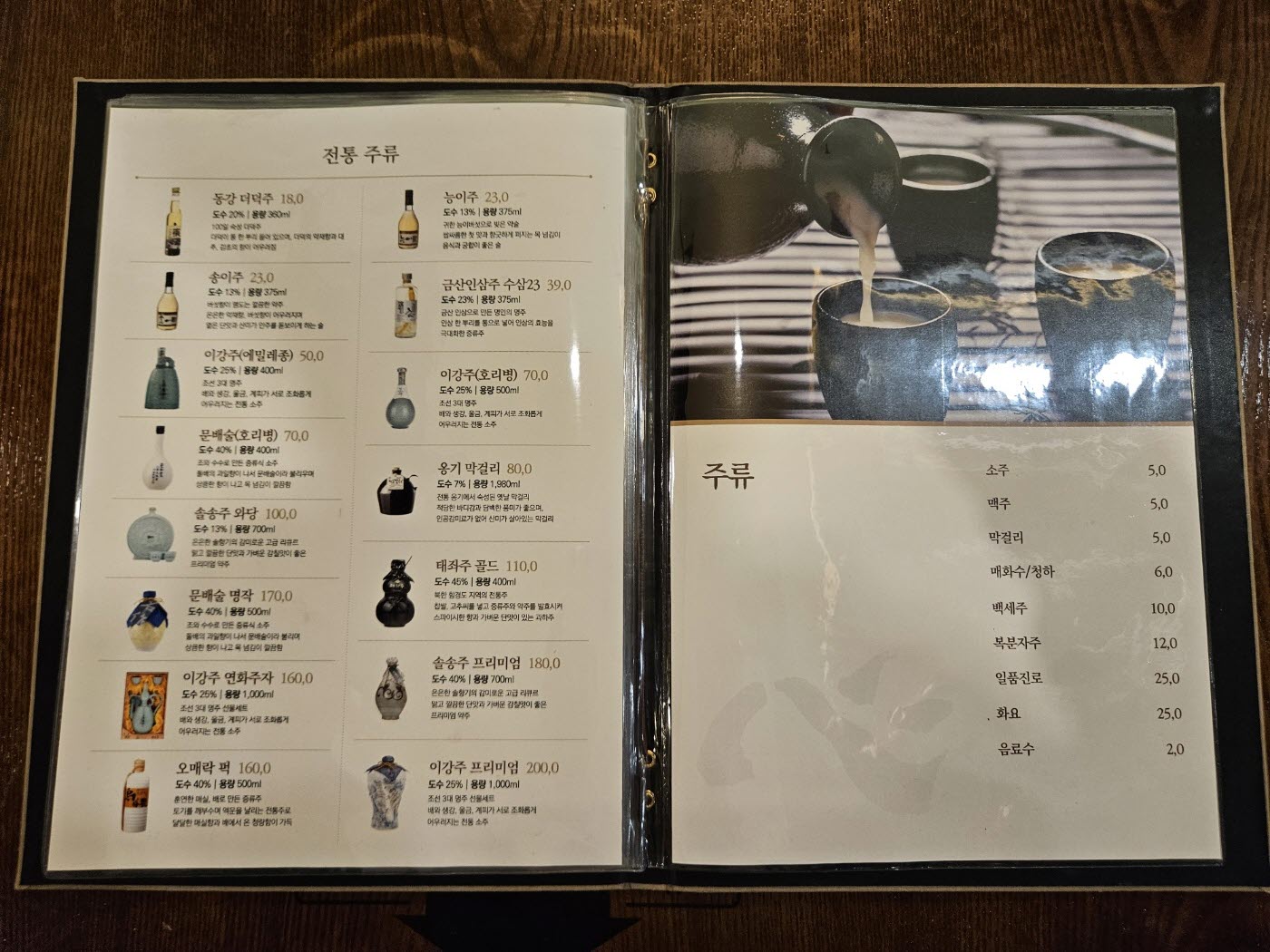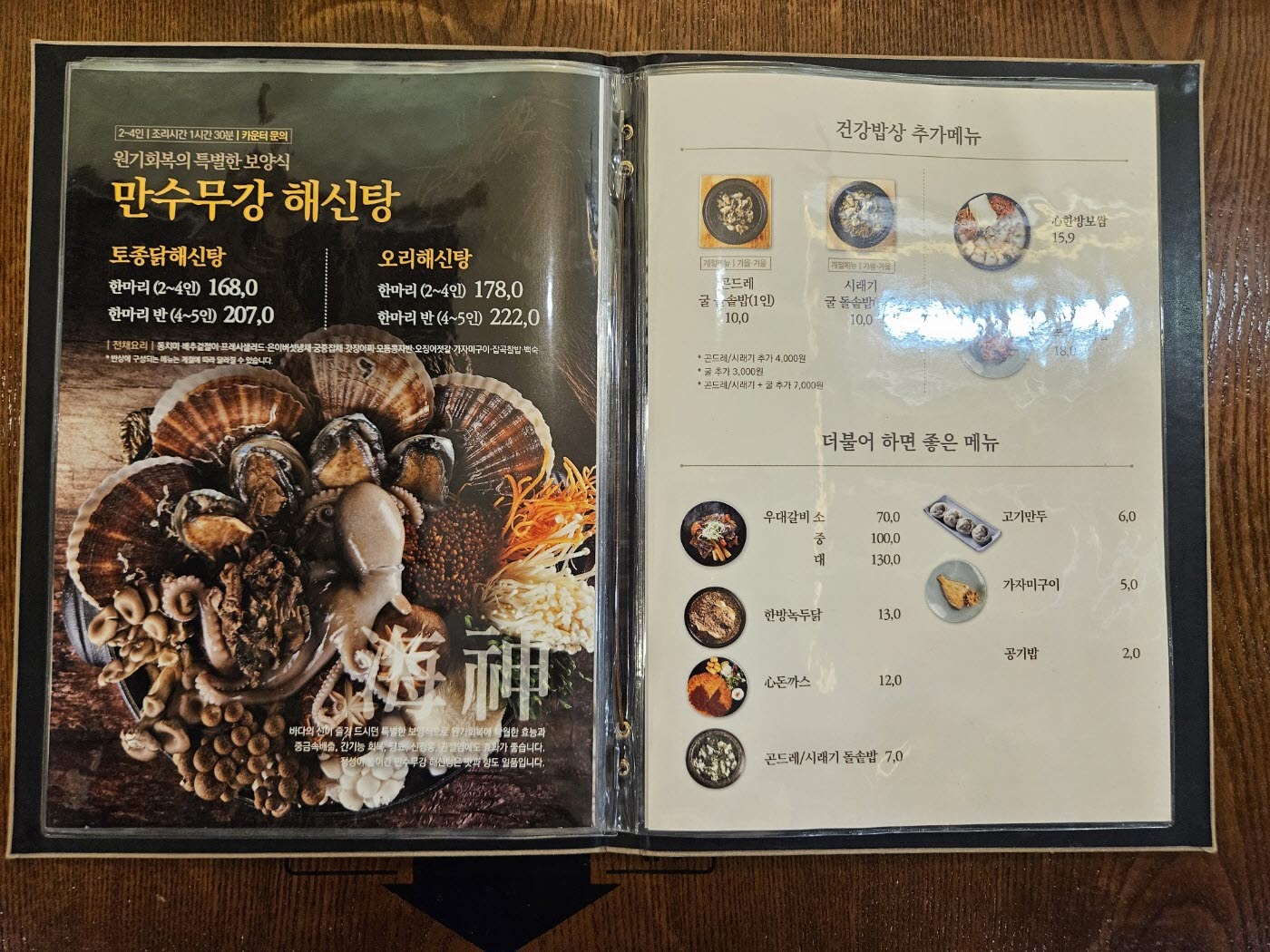 메뉴는 한정식, 불고기 정식, 해신탕등 다양해요.