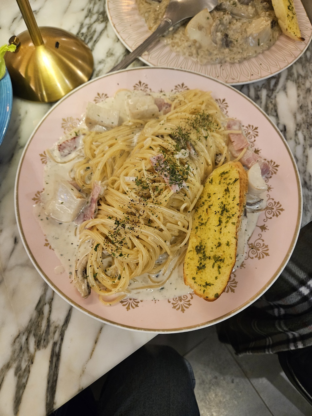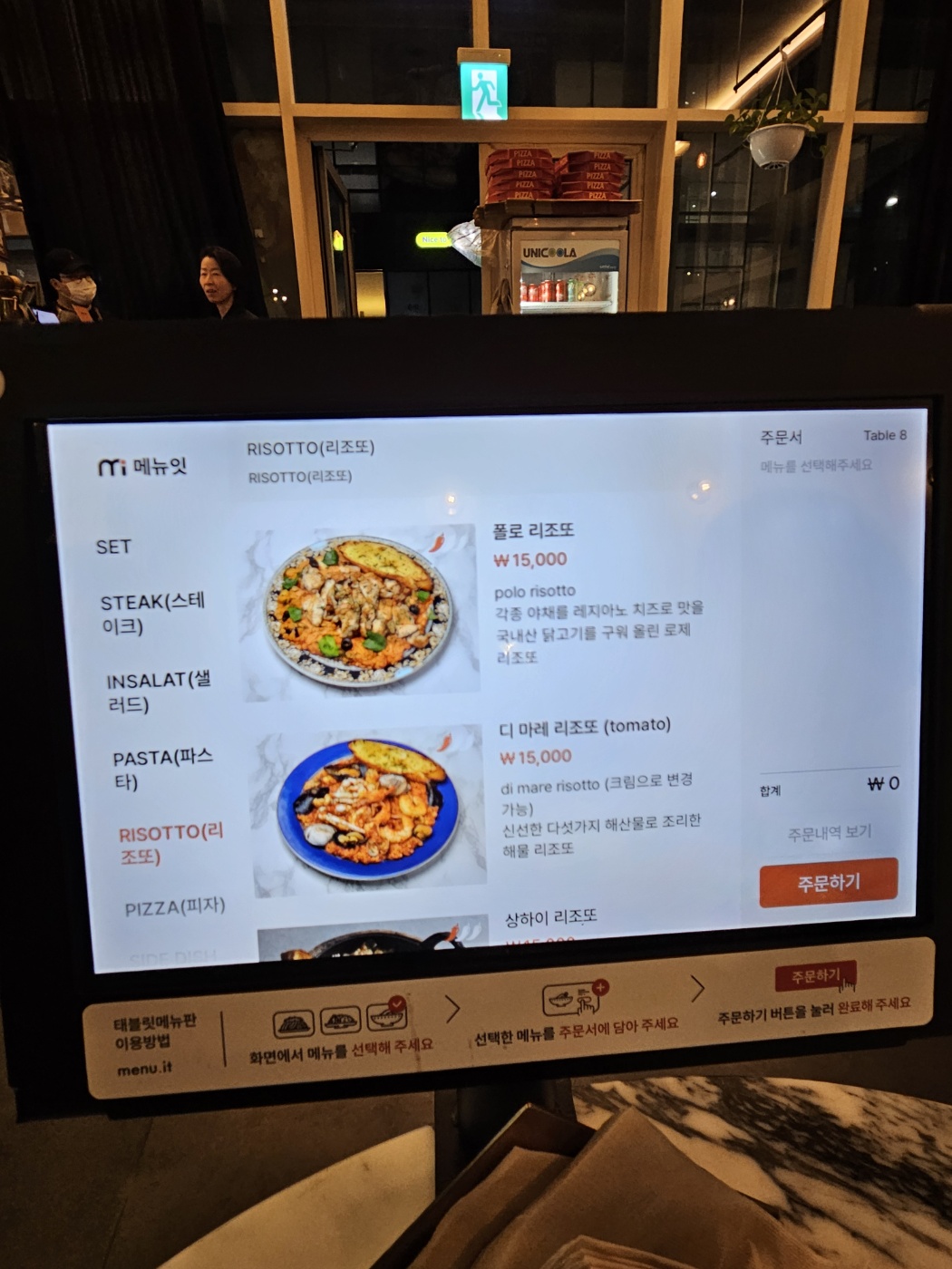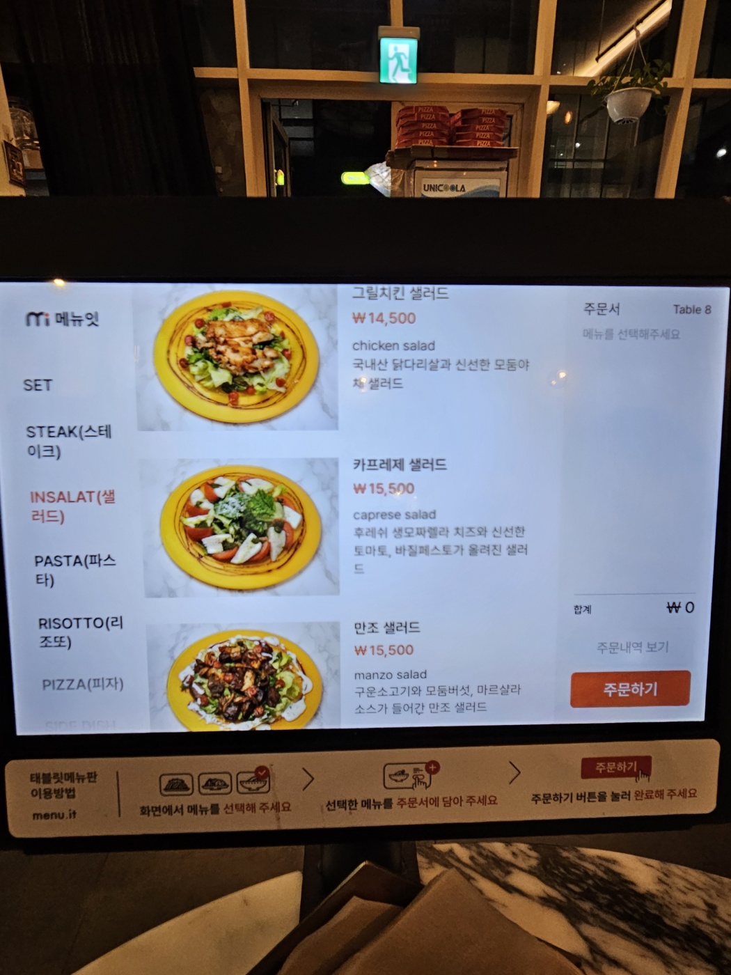 저희는 그릴치킨샐러드,까르보나라,콰트로포르마지오(면추가),만조 리조또 시키고