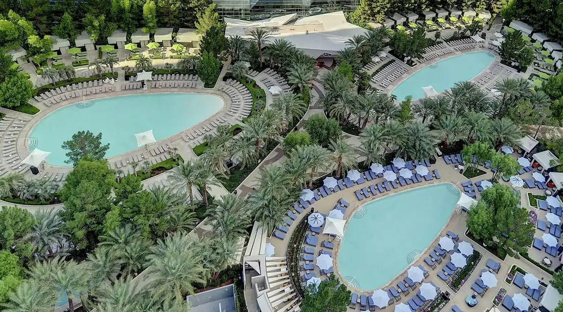 아리아 호텔 수영장은 총 3개의 풀과 3개의 스파풀로 구성되어 있다. 수영장은 오전 9시 부터 저녁 5시까지 이용가능하며 바와 주방은 오전 9시부터 4시반까지 이용 가능하다. 투숙객은 무료로 이용가능하나 Gazebo나 Cananas의 경우는 별도의 요금을 지불해야 한다.