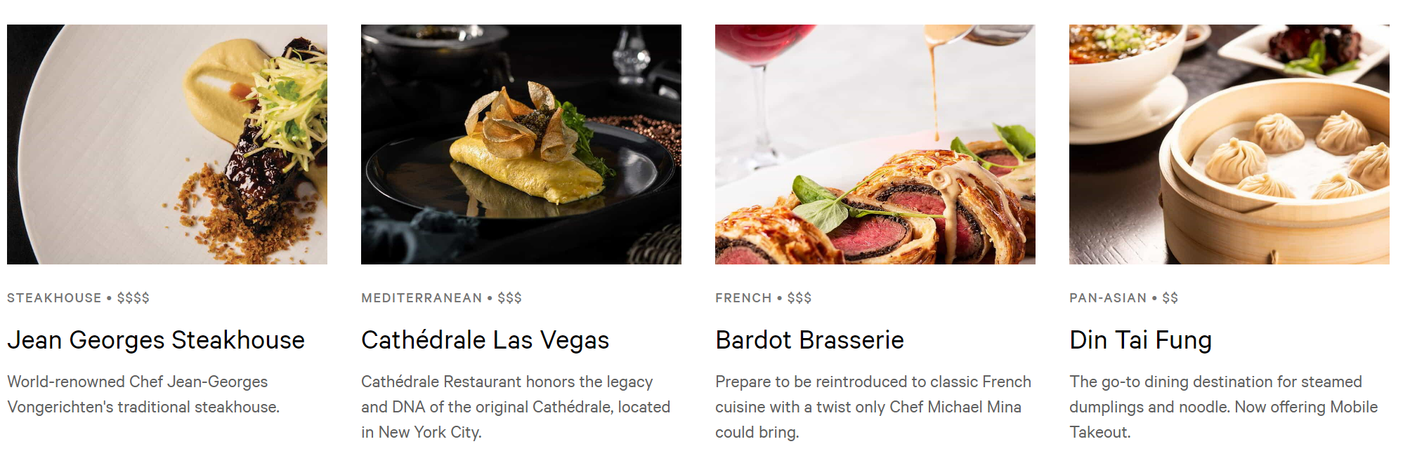 아리아 호텔에서는 이탈리아, 아시아, 멕시코, 디저트등 다양항 음식을 즐길수 있다. 약 20개의 레스토랑이 있으며 스타벅스, 나이트클럽도 즐길수 있다. MGM Rewards 골드 멤버 이상은 온라인으로 우선 예약이 가능하다.