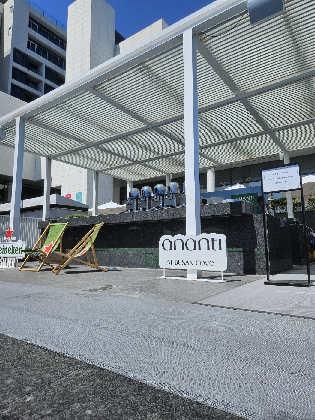 주위에는 무료로 이용할수 비치체어와 간단한 음료를 마실수 있는 바가 있었어요.