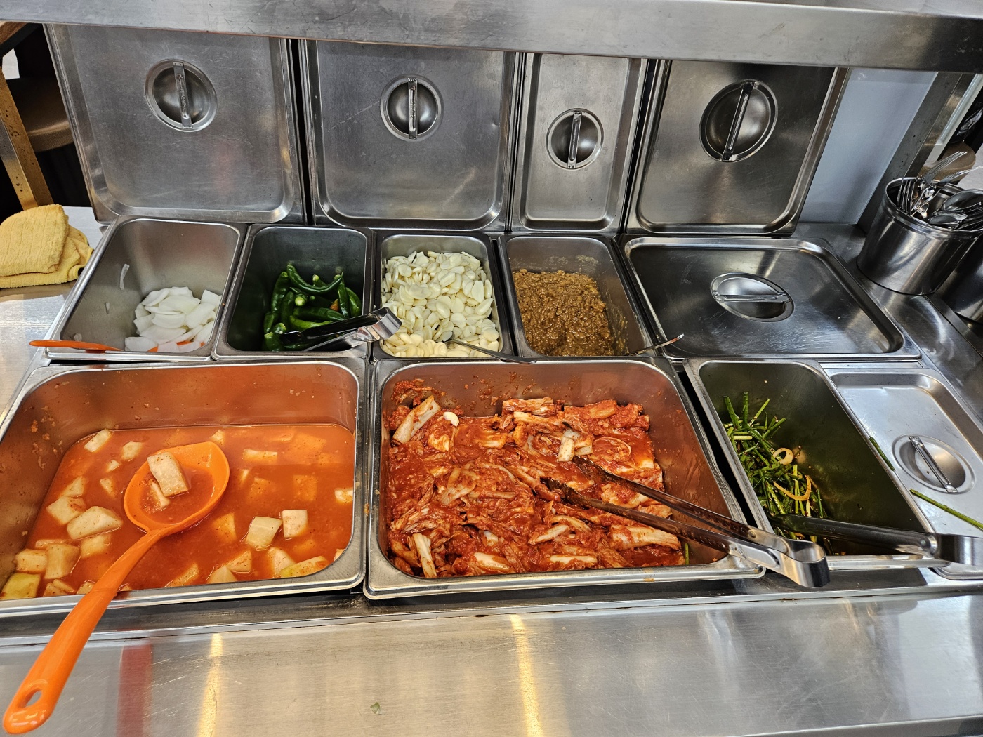 기본 반찬을 김치랑 쌈장만 주시는데 셀프바에 김치, 양파, 고추, 마늘등