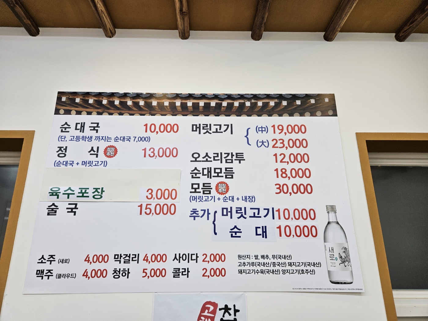 순대국 10,000 / 정식 13,000원. 가장 좋은 거는 고등학생까지는 순대국 7,000원 받습니다.