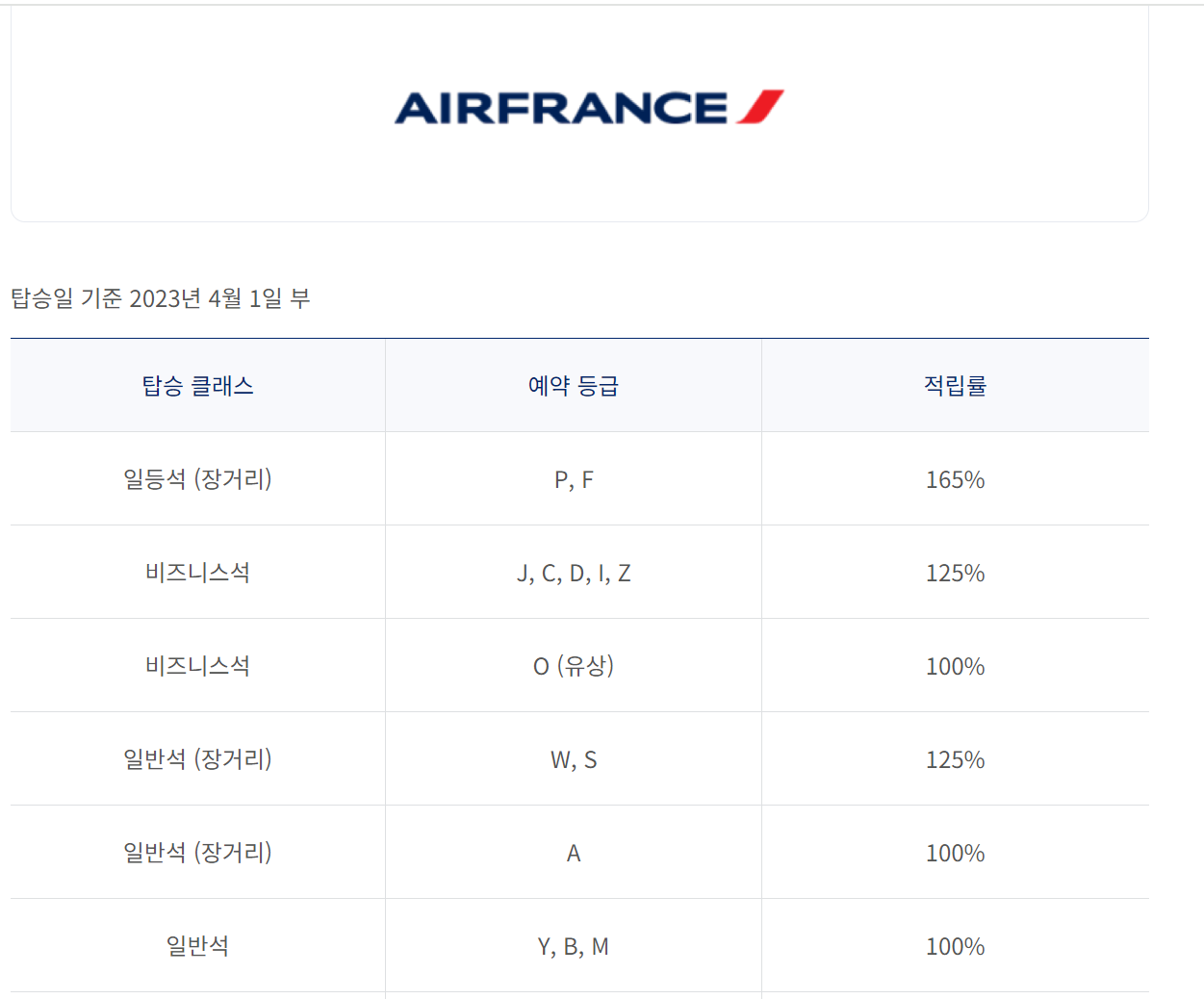 (에어프랑스의 대한항공 마일리지 적립율 출처:대한항공 홈페이지)