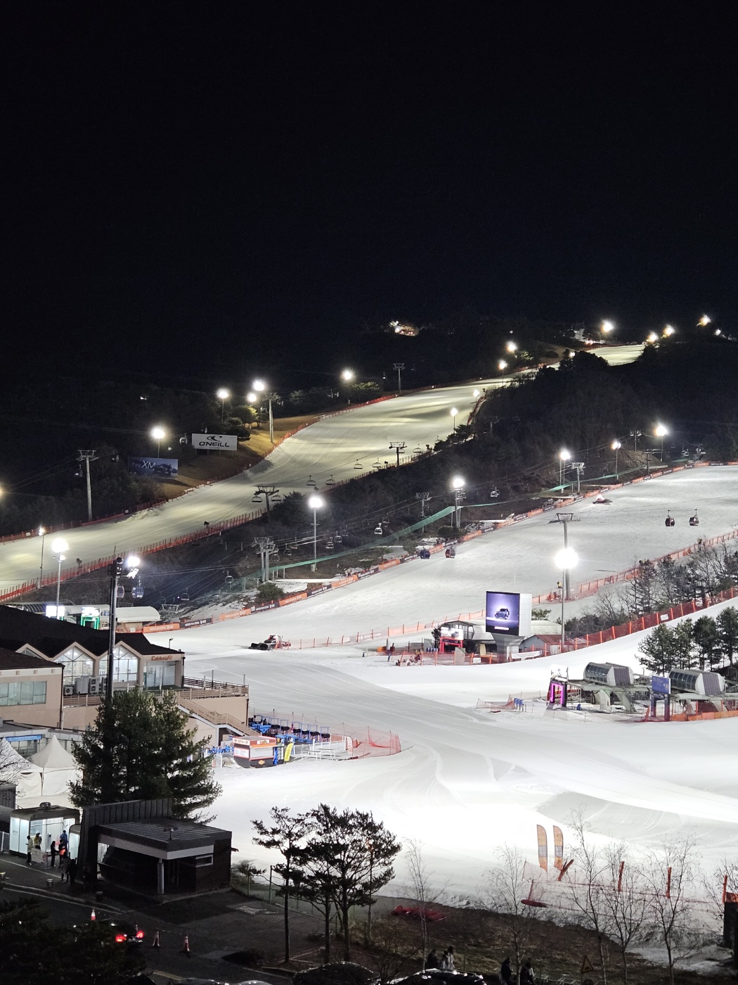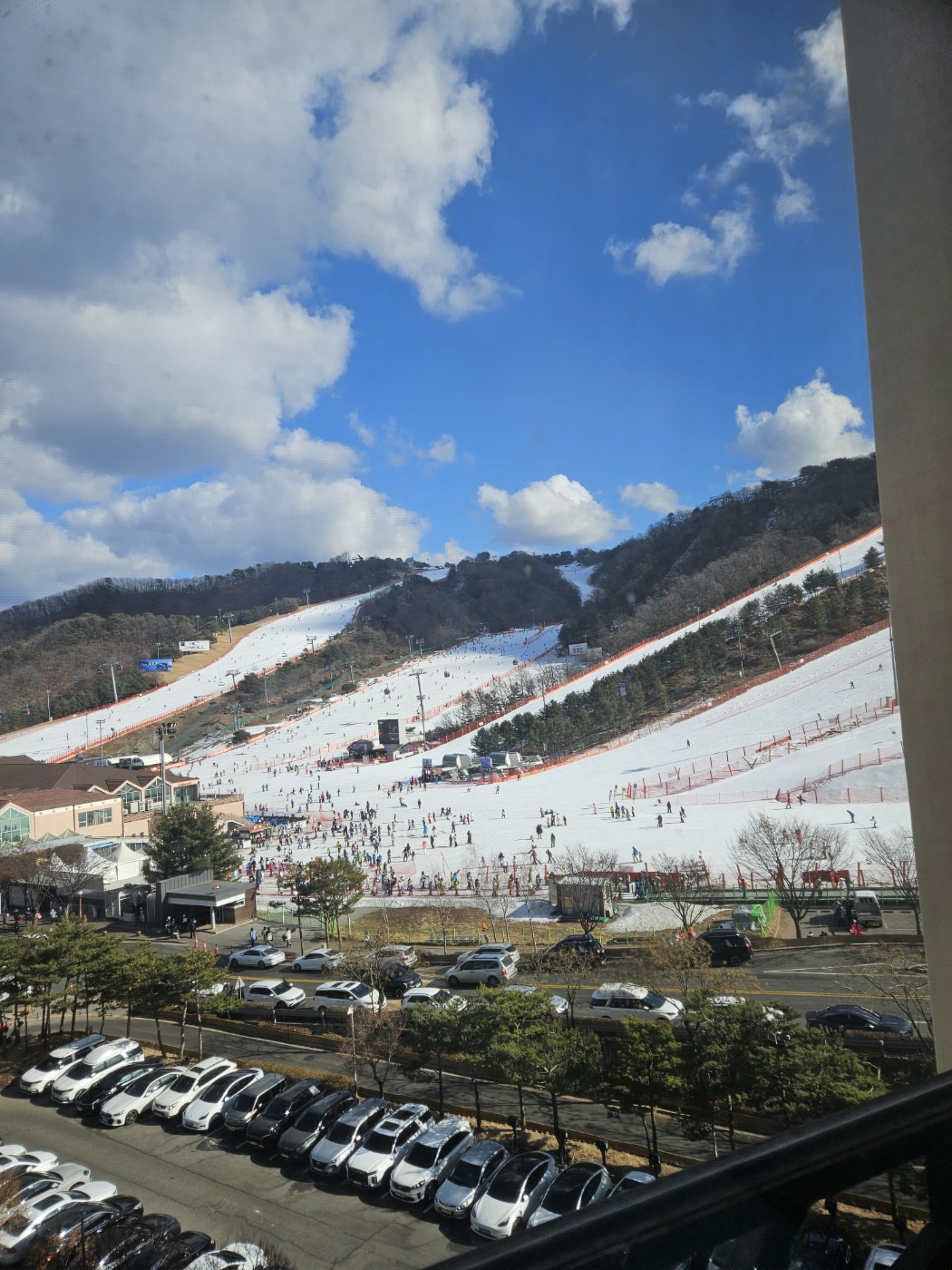 주간과 야간 시작 전 방에서 바라본 스키장 모습이에요.